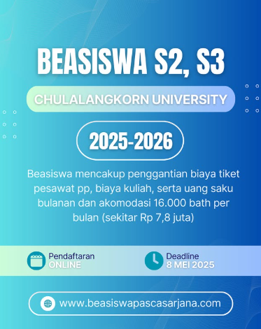 Bagi kamu yang tertarik melanjutkan studi S2 maupun S3 di Thailand, program beasiswa pascasarjana yang ditawarkan Chulalangkorn University, patut dipertimbangkan. Program beasiswa S2 dan S3 ini menyasar bagi kandidat-kandidat dari negara ASEAN maupun non ASEAN, seperti Indonesia. Beasiswa tersebut menawarkan beasiswa S2 untuk studi gelar master selama 2 tahun dan beasiswa S3 untuk studi doktoral selama 3 tahun.
