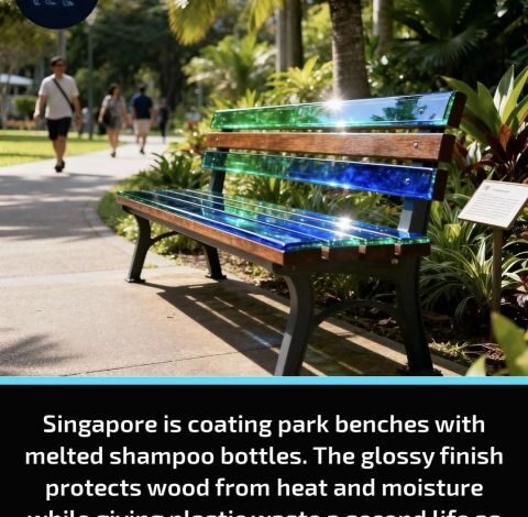 Singapore is giving single-use plastic a second life—literally. Park benches across the city are now coated with melted shampoo and detergent bottles. This glossy, colorful layer protects the wood beneath from heat, moisture, and heavy weather, while repurposing plastic waste that would otherwise end up in landfills or incinerators.
