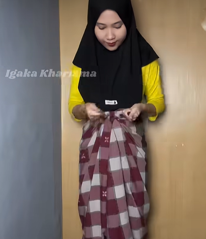 - Langkah Kedua: Lebarkan Kain Tarik kedua sisi samping sarung (kiri dan kanan) selembar mungkin menjauh dari pinggang Anda, sehingga sarung tampak berbentuk pipih dan lebar.