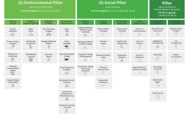 The Environmental Pillar’s alignment with SDGs 7, 12, and 13 emphasizes the need for companies to manage resources sustainably, reduce pollution, and combat climate change. The Social Pillar’s focus on diversity, equity, and inclusion, linked to SDGs 1, 3, and 10, shows how businesses can contribute to societal well-being and equality. The Governance Pillar’s connection to SDGs 16 and 17 reinforces the importance of ethical leadership, transparency, and collaboration.