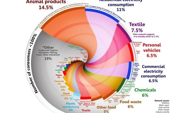 | Animal Products | 14.5% | Livestock farming produces massive amounts of methane ($CH_4$), which is 80 times more potent than $CO_2$ over a 20-year period. |