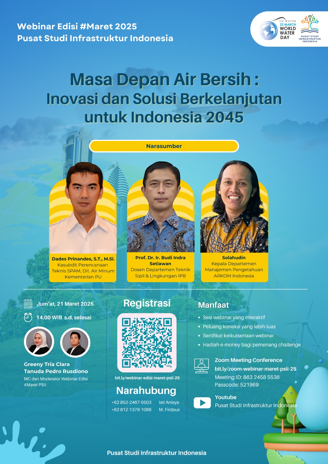 Pusat Studi Infrastruktur Indonesia dengan bangga mengundang Anda untuk berpartisipasi dalam webinar kami yang akan membahas masa depan air bersih dan solusi inovatif yang berkelanjutan menuju Indonesia 2045.