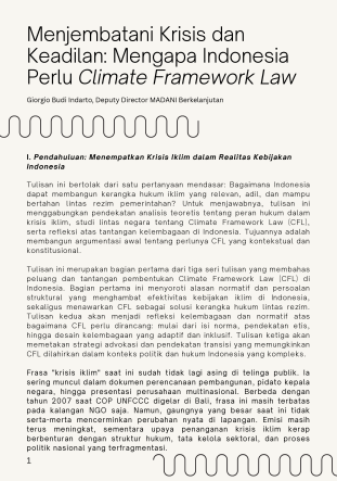 konstitusional. Tulisan ini merupakan bagian pertama dari tiga seri tulisan yang membahas peluang dan tantangan pembentukan Climate Framework Law (CFL) di Indonesia. Bagian pertama ini menyoroti alasan normatif dan persoalan struktural yang menghambat efektivitas kebijakan iklim di Indonesia, sekaligus menawarkan CFL sebagai solusi kerangka hukum lintas rezim.