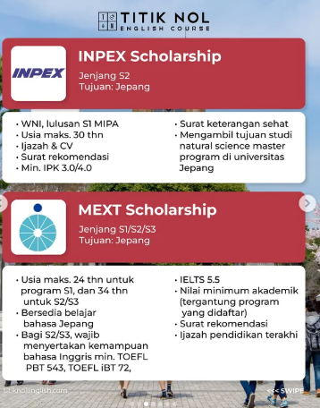 MEXT Scholarship & INPEX Scholarship bakal segera buka, jadi jangan sampai ketinggalan! Persiapkan berkasnya dari sekarang, dan kalau butuh bantuan buat kejar skor TOEFL/IELTS, DM Minol aja!