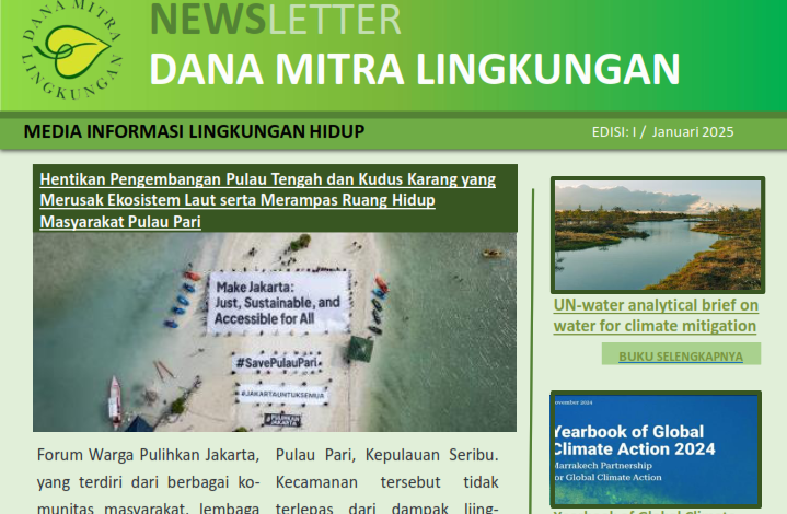 Newsletter Dana Mitra Lingkungan Edisi I bulan Januari 2025 dibuat sebagai wadah penyampaian data, informasi dan pengetahuan terkait lingkungan hidup yang tersaji pada website Dana Mitra Lingkungan secara berkala dalam periode dua minggu.