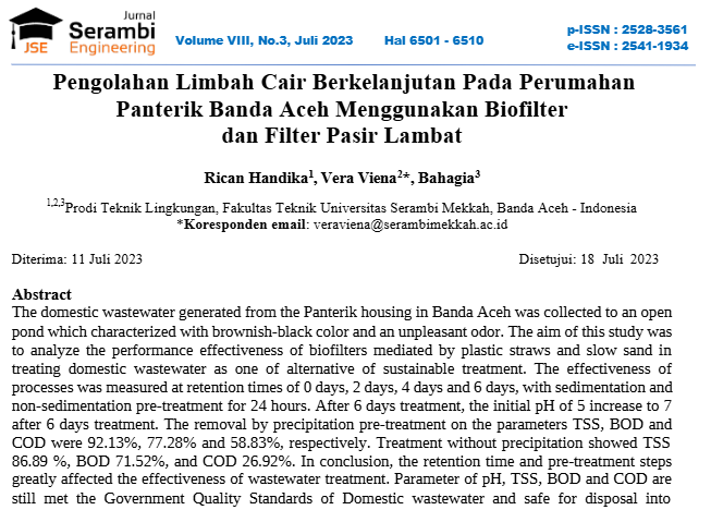 Pengolahan limbah cair berkelanjutan pada perumahan panterik Banda Aceh menggunakan biofilter dan filter pasir lambat