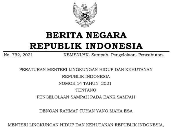 | Judul | Peraturan Menteri Lingkungan Hidup Dan Kehutanan Nomor 14 Tahun 2021 tentang Pengelolaan Sampah pada Bank Sampah |