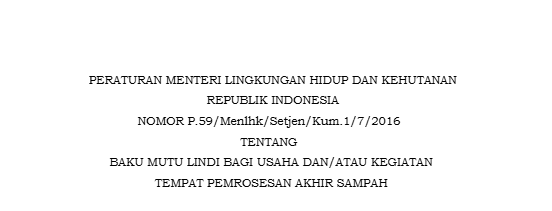 Peraturan Menteri Lingkungan Hidup Dan Kehutanan Nomor 59 Tahun 2016 tentang Baku Mutu Lindi bagi Usaha dan/atau Kegiatan Tempat Pemrosesan Akhir Sampah