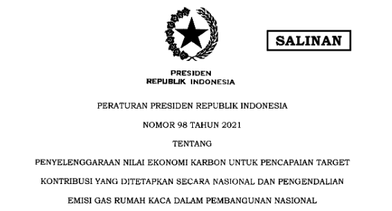 Peraturan Presiden (Perpres) Nomor 98 Tahun 2021 tentang Penyelenggaraan Nilai Ekonomi Karbon untuk Pencapaian Target Kontribusi yang Ditetapkan Secara Nasional dan Pengendalian Emisi Gas Rumah Kaca dalam Pembangunan Nasional
