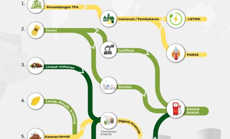 • Insinerasi (Pembakaran Langsung): Sampah dibakar untuk memanaskan air, menghasilkan uap yang kemudian memutar turbin listrik.