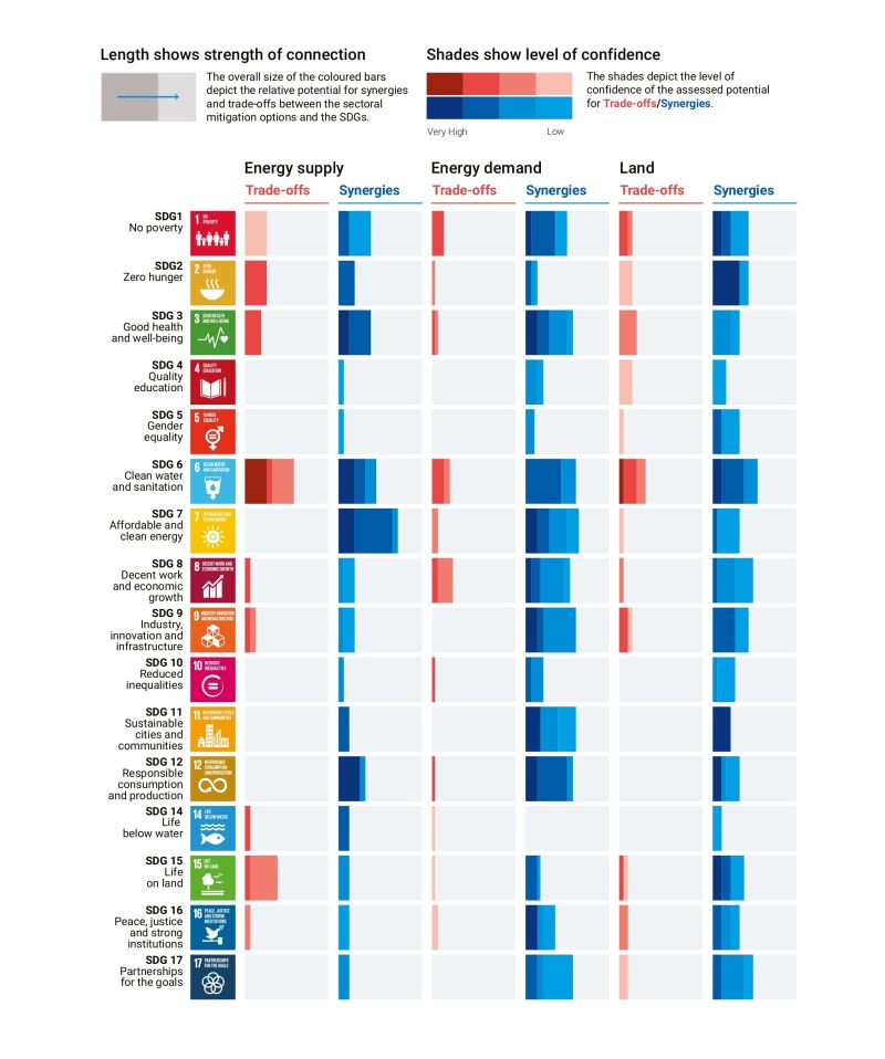 Climate change mitigation measures can have varied impacts on the Sustainable Development Goals (SDGs), as illustrated by the matrix of blue and red bars. Blue bars represent potential synergies where efforts to reduce greenhouse gas emissions simultaneously contribute to SDG targets. Red bars highlight trade-offs that arise when mitigation strategies undermine certain development objectives. The length of each bar indicates the relative strength of the relationship, while the color shade reflects the level of confidence in that assessment.