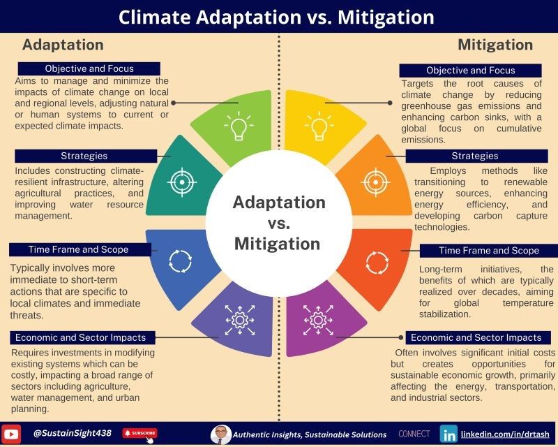 Adaptation: Involves constructing flood defenses, climate-proofing infrastructure, altering agricultural practices, and improving water management.