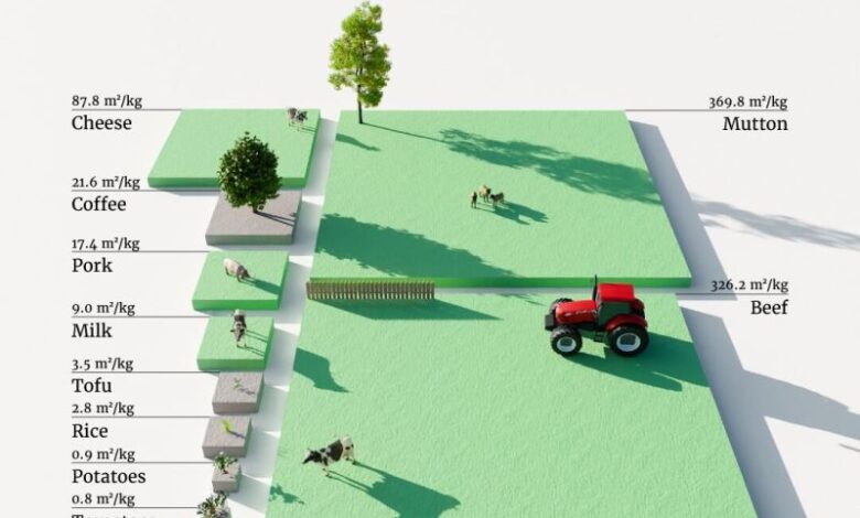 The disparity in land use between different foods is staggering. To visualize the impact, consider the “rent” each food pays in terms of Earth’s surface area: